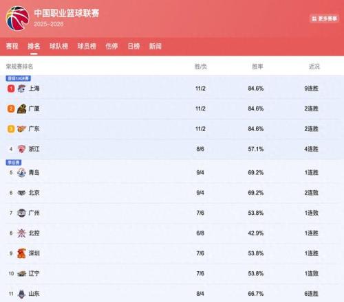 CBA排行榜大变:北京掉出前5浙江挤进前4,广东冲第1,上海9连胜